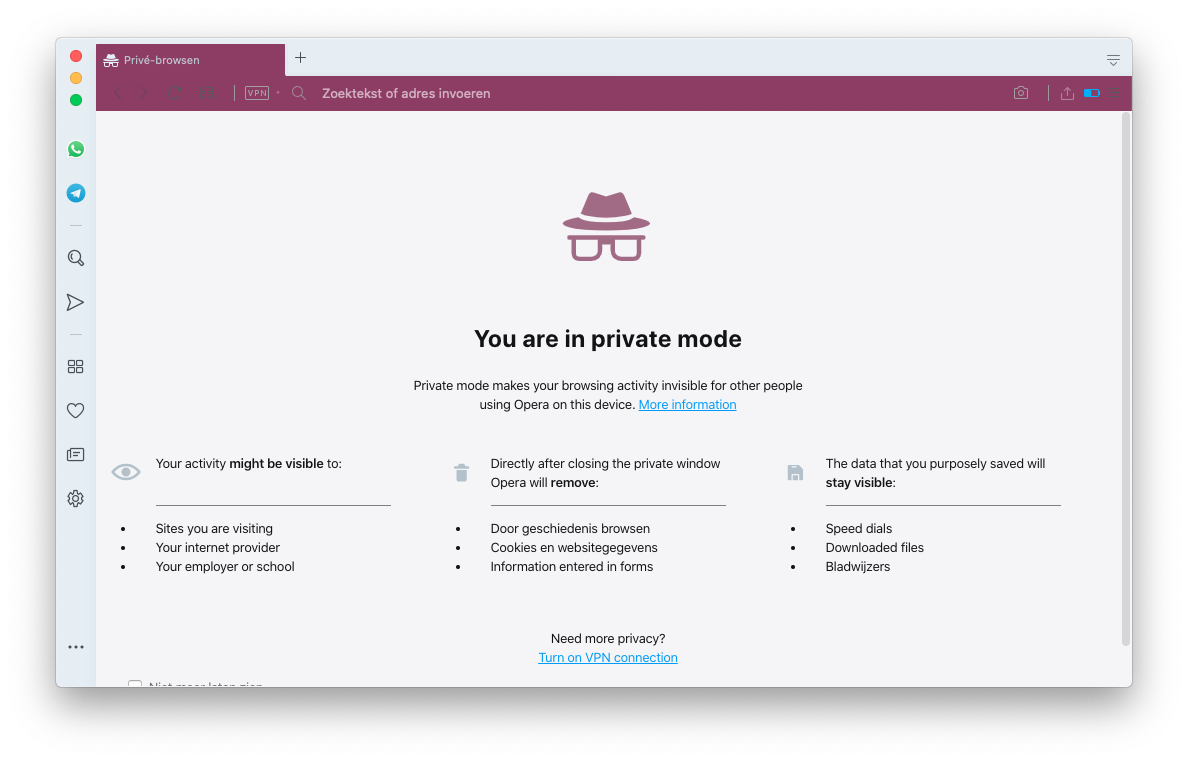 Opera legt verder uit dat privévensters zorgen dat andere mensen op dezelfde computer niet zien welke sites je bezocht hebt, maar dat je internet provider, je werkgever, je school en de websites die je bezoekt dat wel kunnen zien. Als je dat niet wilt dan zal het inschakelen van de VPN in Opera weer voor meer anonimiteit zorgen (klik op VPN-icoontje in het begin van de adresbalk en zet deze op Aan).