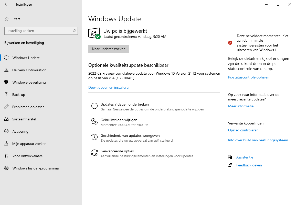 Versie End of life (einde updates) Windows 10 20H2 10 mei 2022 Windows 10 21H1 13 december 2022 Windows 10 21H2 mei 2023 Windows 11 21H2 10 oktober 2023