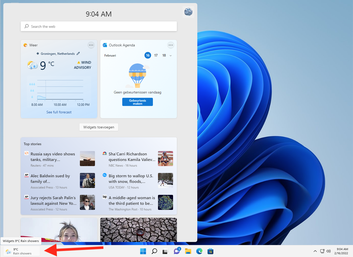 - De Weer-widget verschijnt nu aan de linkerkant van de taakbalk. En als je er met je muis overheen gaat zie je ook de andere widgets.