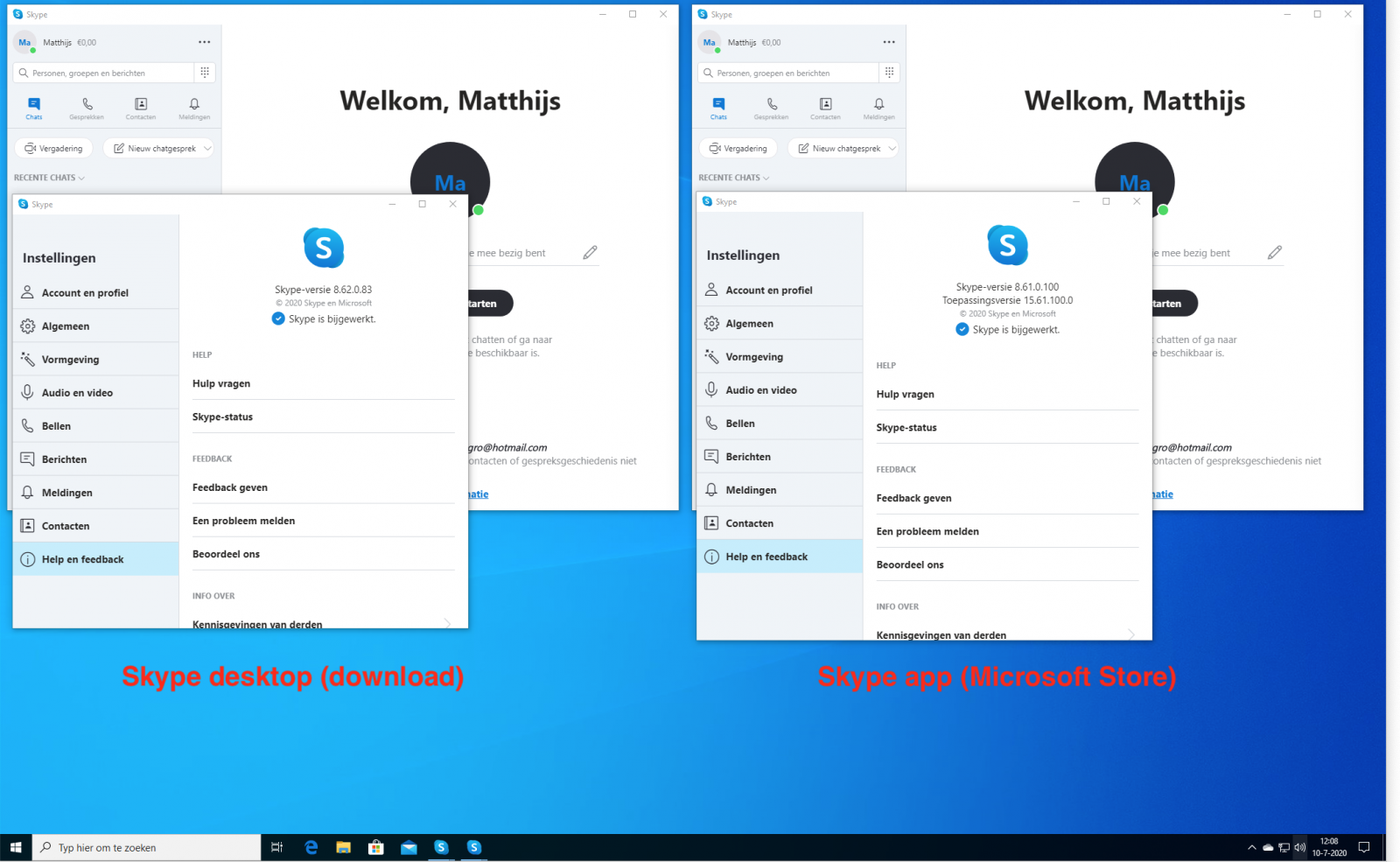 Microsoft heeft vorige maand met Skype 8.61 (die te downloaden is van de Skype-website) en versie 15.61.100 uit de Microsoft Store (en die voorgeïnstalleerd staat op Windows 10) de beide varianten grotendeels gelijkgetrokken. Bestonden er vroeger nog enige verschillen in functionaliteit tussen de Store app en de Desktop applicatie, nu moeten ze (bijna) hetzelfde kunnen en krijgen ze in het vervolg dezelfde updates met dezelfde nieuwe functies.