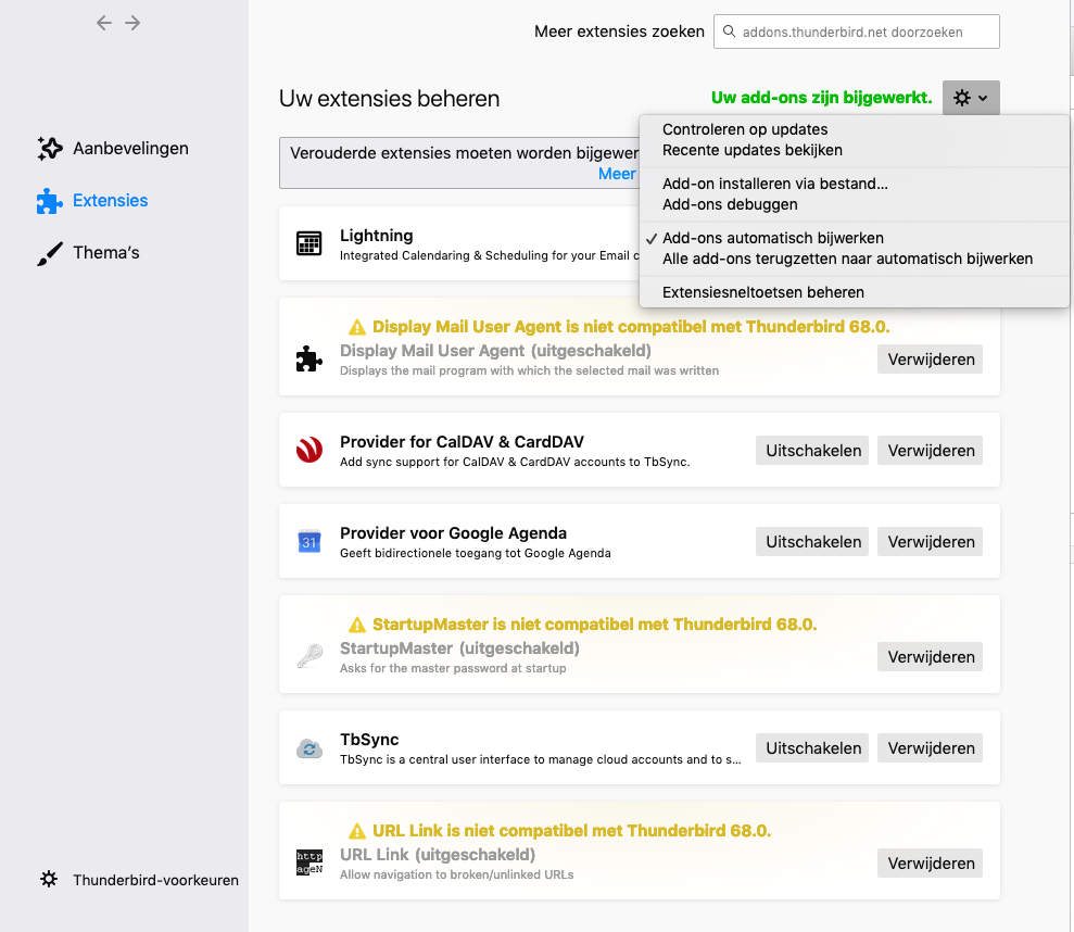 Toen wij de update naar Thunderbird 68 hadden gedaan merkten we dat een aantal van onze geliefde extensies was uitgeschakeld. Agenda Lightning (die geïntegreerd is in Thunderbird) werkte gelukkig wel. Maar bijvoorbeeld Display Mail User Agent, StartUp Master en URL link werken niet meer. Hopelijk gaan de ontwikkelaars deze add-ons snel aanpassen voor de nieuwe Thunderbird.