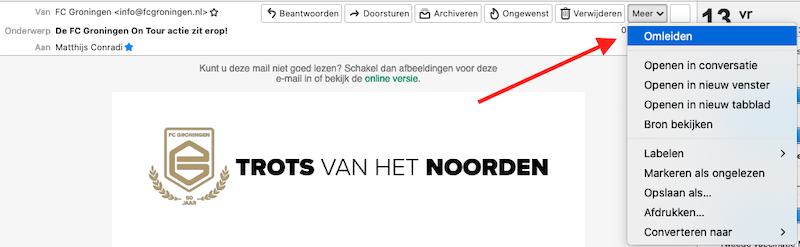 - Je kunt mailberichten 'redirecten', in het Nederlands te vinden onder Meer | Omleiden