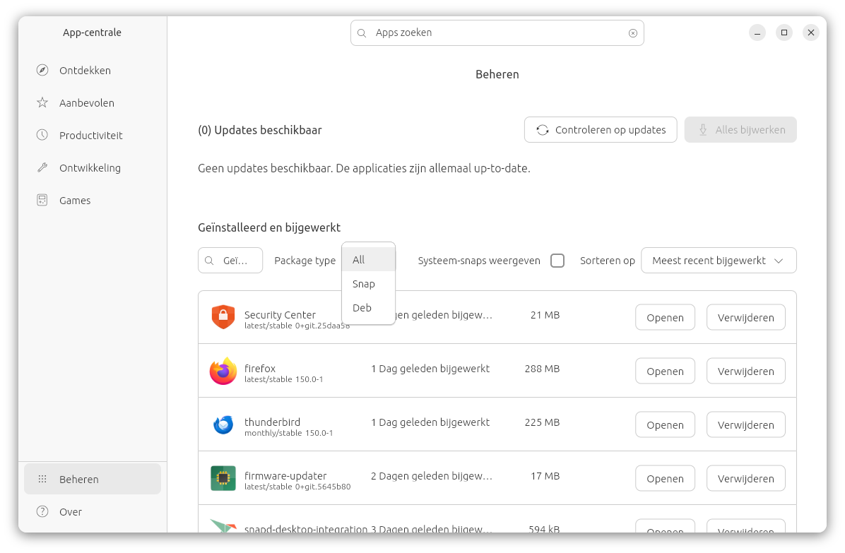 In App Center (App-centrale) kun je onder menu Beheren filteren op Snap- of Deb-pakketten. Snap-pakketten kun je hier ook verwijderen