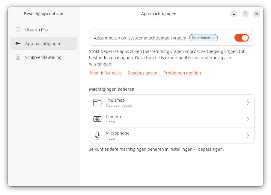 Het nieuwe Beveiligingscentrum in Ubuntu 26.04 moet de centrale plek gaan worden voor beveiligingsgerelateerde zaken. Het biedt de mogelijkheid om je gratis te registreren voor Ubuntu Pro, waarmee je tien jaar updates en betere beveiliging kunt krijgen. Ook kun je hier de experimentele functie App-machtigingen aanzetten, zodat apps toestemming moeten vragen voor toegang tot bepaalde mappen en bestanden en tot de camera en microfoon. Ten slotte kun je in het Beveiligingscentrum de instellingen voor schijf encryptie bekijken. Nieuw is namelijk ook dat je, als je dat wilt, je schijf bij de installatie van Ubuntu kunt versleutelen met onder meer TPM 2.0. Als je computer dat ondersteunt natuurlijk en Secure Boot aanstaat.