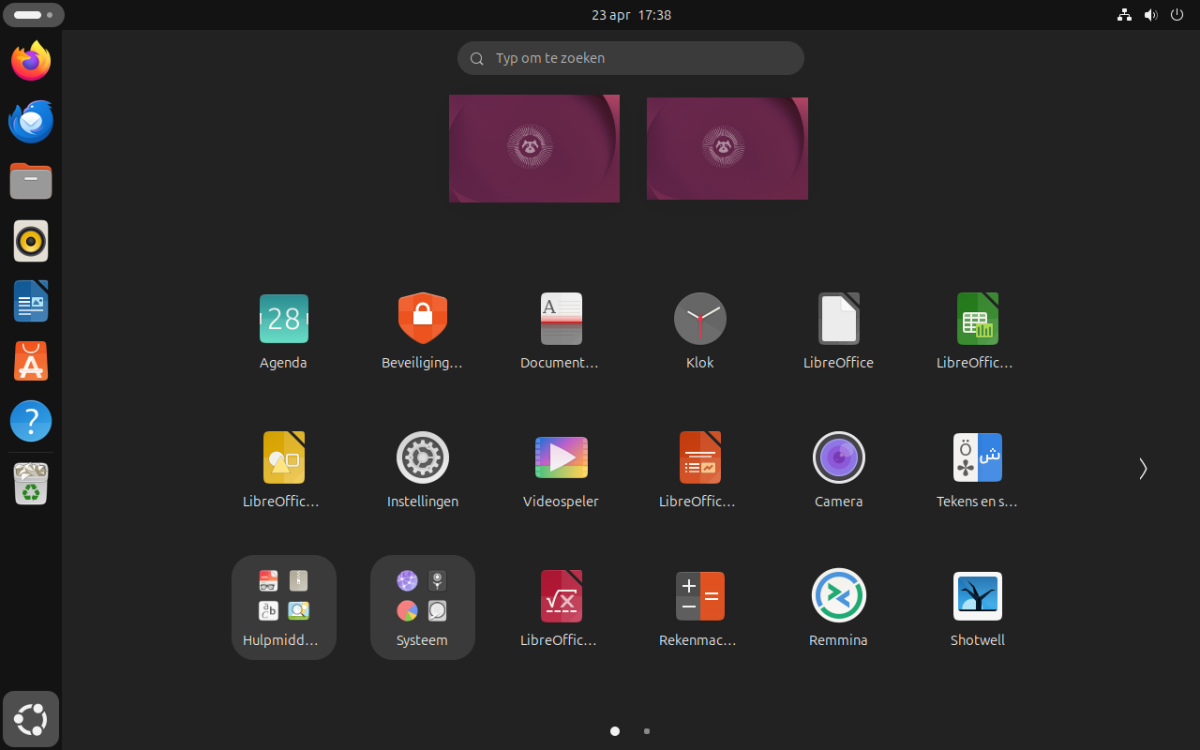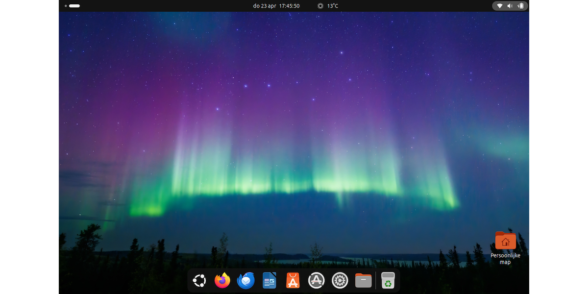 De afbeelding helemaal boven aan dit artikel is een met een paar klikken aangepast bureaublad van Ubuntu 26.04. Klik rechts op het bureaublad en kies Achtergrond aanpassen voor een andere afbeelding. En ga naar Instellingen | Ubuntu Desktop en zet Panel Mode uit bij Starter en kies voor Onderaan bij Position on Screen.