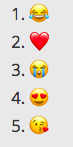 Op iOS zijn de vijf populairste emoji: huilen van het lachen, rood hartje, huilend gezichtje, gezichtje met hartjesogen en gezichtje met hartje als kusje.