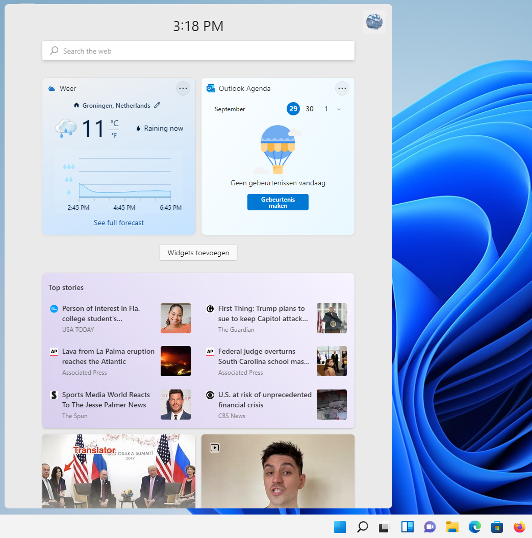 - Widgets komen terug naar Windows 11 (na weggeweest te zijn in Windows 10). Er zijn bijvoorbeeld widgets met agenda, foto's, weer, sport en nieuws. Behalve widgets van Microsoft kun je gelukkig ook widgets van derde partijen toevoegen. De Nieuws- en weerbalk die net in Windows 10 is geïntroduceerd verdwijnt dus weer in Windows 11.