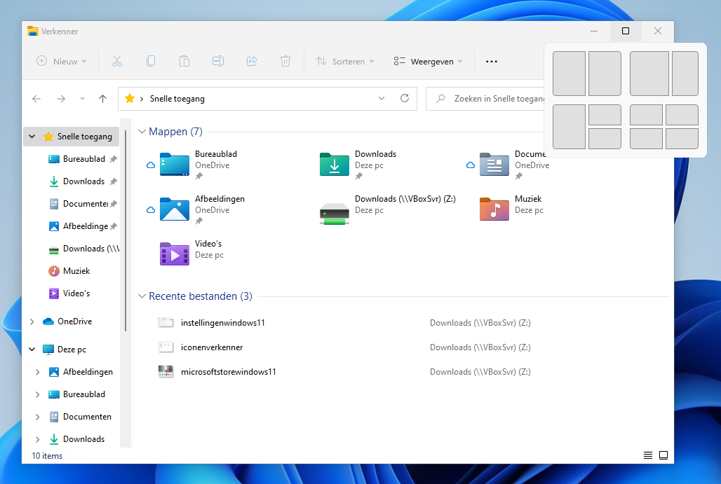 - Er zijn nieuwe mogelijkheden om meerdere vensters snel te rangschikken met 'snap lay-outs'. Als je je muis over de maximaliseer-knop beweegt kun je kiezen uit verschillende plekken om vensters neer te zetten en te rangordenen. Je kunt kiezen uit twee, drie of vier vensters in verschillende constellaties (zie de afbeelding).