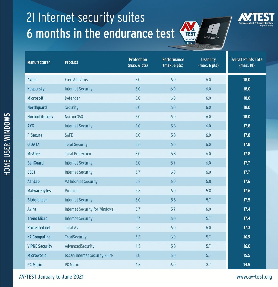 AV Test onderwerpt meerdere keren per jaar diverse virusscanners aan strenge tests om de mate van bescherming, vertraging en vals positieve meldingen vast te stellen. Een overzicht van de tests over de eerste helft van 2021 geeft de volgende resultaten.