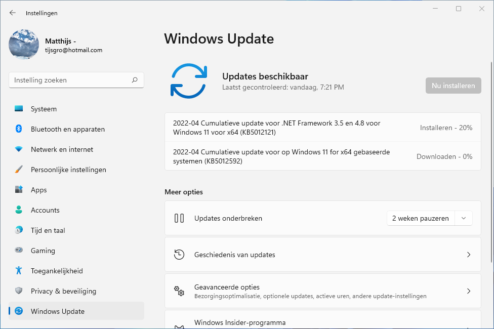 Versie Update Build Windows 11 (21H2) KB5012592 22000.613 Windows 10 21H2 KB5012599 19044.1645 Windows 10 21H1 KB5012599 19043.1645 Windows 10 20H2 KB5012599 19042.1645 Windows 8.1 KB5012670 - Versies 21H2, 21H1 en 20H2 krijgen dezelfde updates met hetzelfde KB-nummer omdat ze grotendeels identiek zijn. De maandelijkse beveiligingsupdates worden elke tweede dinsdag van de maand uitgebracht voor Windows 11, 10 en 8.1. Deze updates worden automatisch geïnstalleerd.
