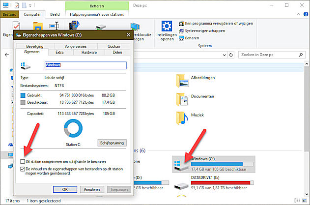 Open de verkenner en klik met de rechtermuisknop op de C schijf, klik op Eigenschappen.