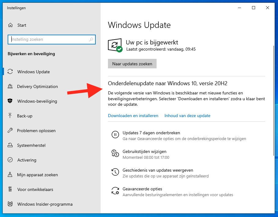 De halfjaarlijkse update wordt via Windows Update uitgerold. En Microsoft raadt aan dat je wacht tot je pc automatisch versie 20H2 krijgt aangeboden. Dan weet je zeker dat de meeste kinderziektes opgelost zijn en dat je pc geschikt is voor de upgrade (ongeschikte pc's worden geblokkeerd tot de problemen verholpen zijn). Je kunt kijken of je Windows 10 versie 20H2 al via Windows Update kunt downloaden:
