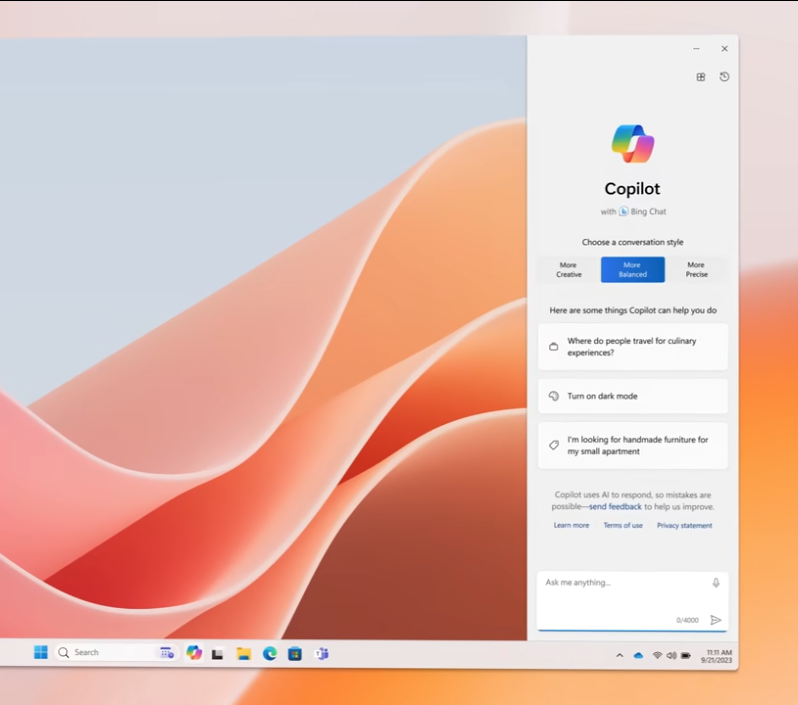 Bing in Microsoft Edge had in maart al op ChatGPT gebaseerde kunstmatige intelligentie gekregen, zodat je al chattend vragen kon stellen en zoeken. Deze AI-ervaring wordt nu uitgebreid naar je bureaublad: Copilot is je intelligente assistent die in de zijbalk zit. Je kunt opdrachten geven aan Copilot, zoals: speel vrolijke muziek, open apps, organiseer vensters, zet de donkere modus aan, verwijder de achtergrond van een foto, vat tekst of een webpagina samen, schrijf een stuk over een onderwerp, zoek naar informatie over een onderwerp en veel meer.