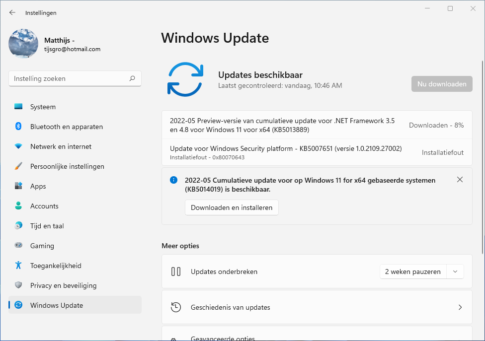 24 mei 2022 KB5014019 Windows 11 22000.708 2 juni 2022 KB4014023 Windows 10 21H2 19044.1741 Windows 10 21H1 19043.1741