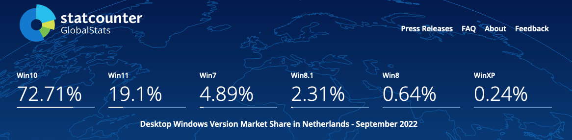 Wereldwijd is het percentage Windows 11 gebruikers nog lager met 13%. Ter vergelijking: Windows 10 stond in 2016 (een jaar na het verschijnen) wereldwijd op 24% van de computers en in Nederland zelfs op 39%.
