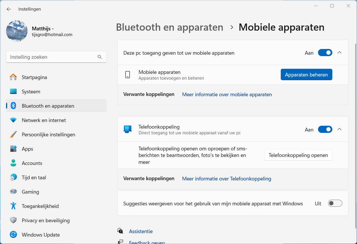 • Nieuw is dat je je mobiele telefoon kunt beheren onder Instellingen | Bluetooth en apparaten | Mobiele apparaten. Ook kun je met het Knipprogramma recente foto's op je Android telefoon bewerken. Hiervoor moet je je pc toegang geven tot je smartphone.