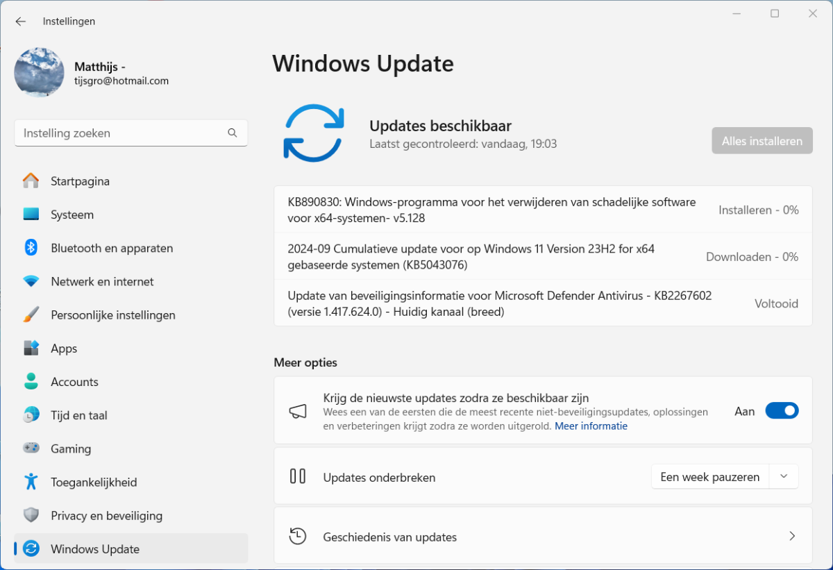 Versie Update Build Windows 11 23H2 KB5043076 22631.4169 Windows 11 22H2 KB5043076 22621.4169 Windows 10 22H2 KB5043064 19045.4894 De maandelijkse beveiligingsupdates verschijnen elke tweede dinsdag van de maand voor Windows 10 en 11. Deze updates worden automatisch geïnstalleerd.