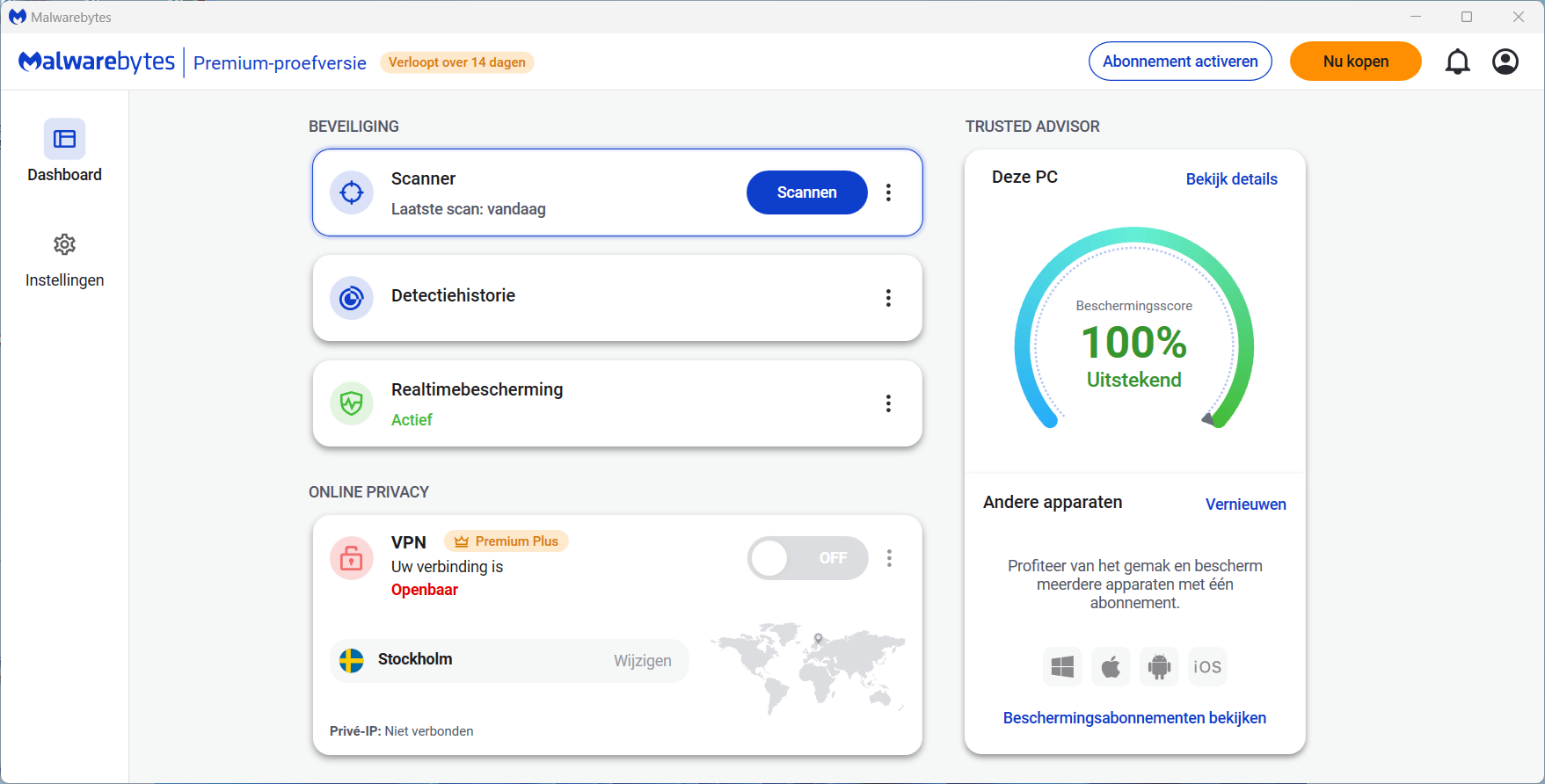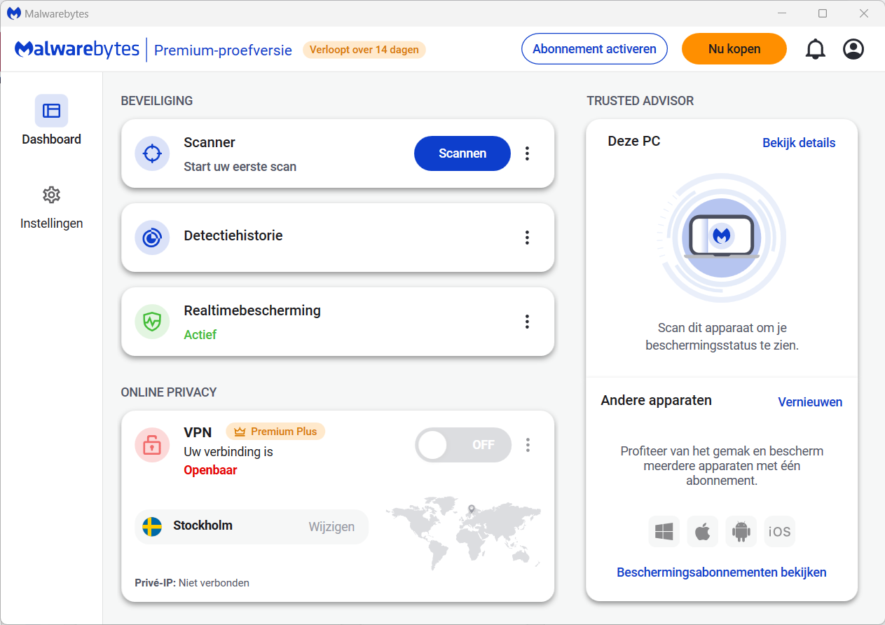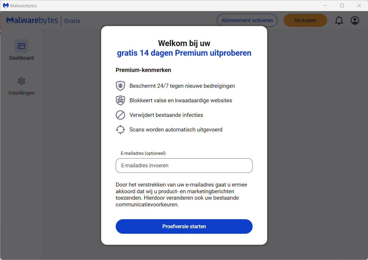 Je krijgt 14 dagen de proefversie van de betaalde premium versie van Malwarebytes 5, met realtime bescherming. Daarna, als je de gratis versie blijft gebruiken, heb je weer de on demand (op verzoek) malwareverwijderaar. Deze gratis versie is een aanvulling op je pc bescherming. De betaalde versie moet kunnen concurreren met andere virusscanners.