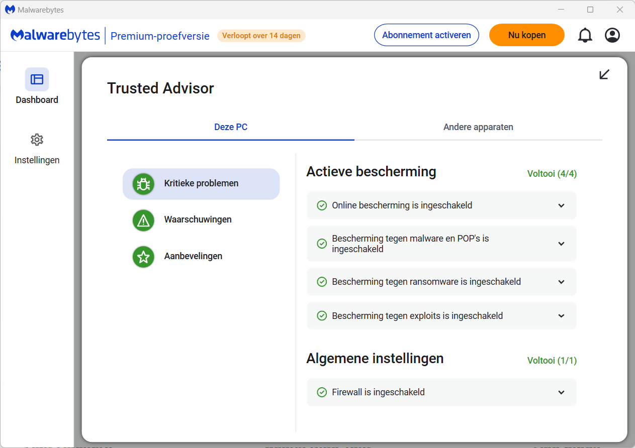 Nieuw in Malwarebytes 5 is de nog niet vertaalde 'Trusted Advisor' die aanbevelingen doet voor de bescherming van je pc. Die kijkt of online bescherming en bescherming tegen malware en PUPs, ransomware en exploits aanstaat (dit is alleen voor de Premium versie), of je een firewall en automatische updates hebt ingeschakeld hebt en of je de Browser Guard extensie van Malwarebytes in je browser(s) hebt geïnstalleerd.