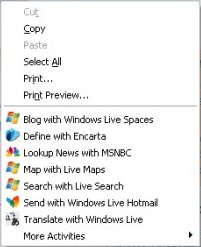 Activities maken het mogelijk om, via het rechtermuis-menu, een pagina direct te vertalen, te verzenden met Hotmail of om te gaan bloggen met Windows Live Spaces. Ook kunt u zo informatie en producten opzoeken op eBay, Facebook en StumbleUpon. Verder zijn kaarten beschikbaar van Live Search Maps en - opvallend in het licht van een mogelijke overname van Yahoo! door Microsoft - Yahoo! Local Maps. Activities van concurrent Google zijn (nog?) niet te gebruiken in IE8, terwijl de zoekgigant natuurlijk ook veel van dit soort webservices aanbiedt. Maar misschien komt dit later nog.