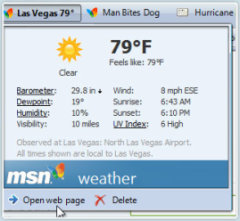 De tweede nieuwe functie zijn de WebSlices. Net als bij een rss feed kunt u zich abonneren op bepaalde sites die deze functionaliteit gaan aanbieden. Als u daarna op de koppeling naar deze website in uw Favorieten-werkbalk klikt dan krijgt u een klein venster te zien met actuele inhoud van die site. Omdat hierin niet alleen tekst (zoals bij rss), maar ook afbeeldingen te zien zijn is dit uitermate geschikt voor bijvoorbeeld het weerbericht. Een soort verrijkte rss-feeds zijn dit dus.