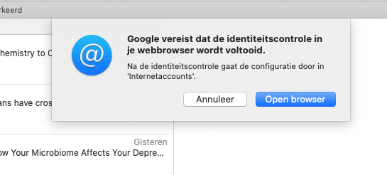 Als ik een Gmail account wil toevoegen in Mail in macOS dan krijg ik dit venster: