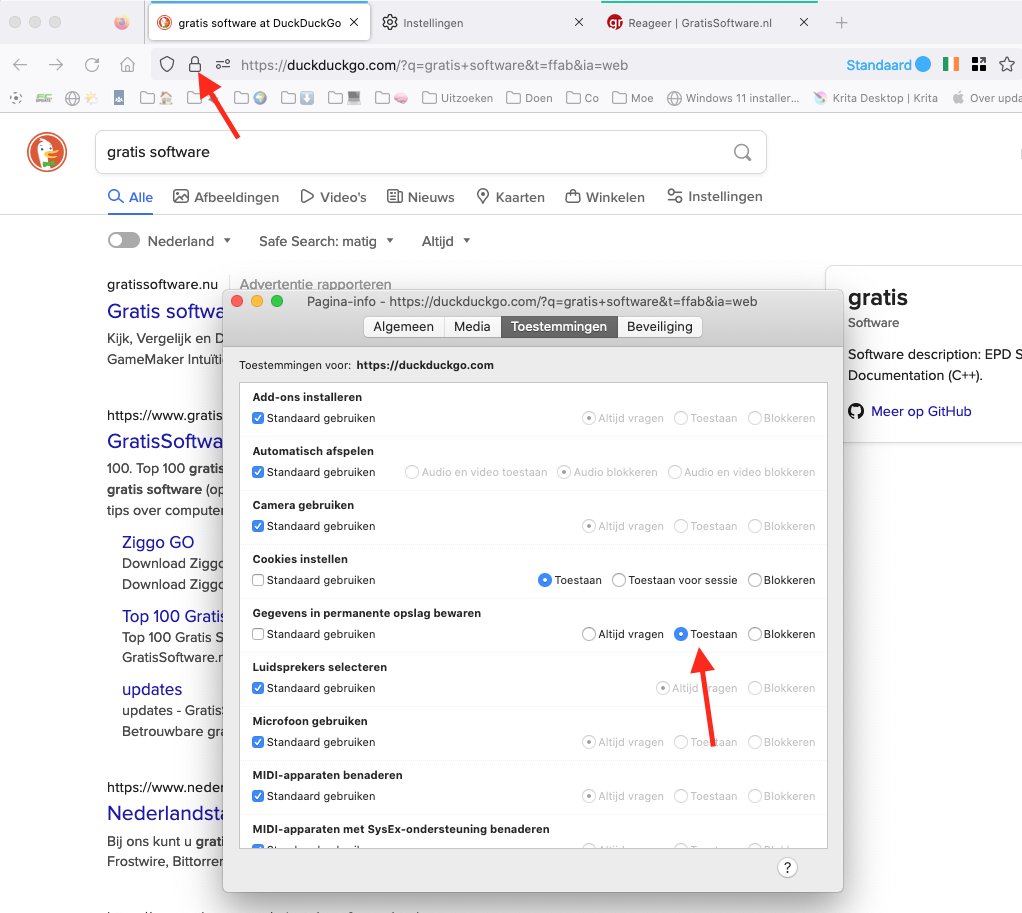 Voor de website van DuckDuckGo moet je waarschijnlijk cookies of gegevensopslag toestaan in je web browser (welke gebruik je?)