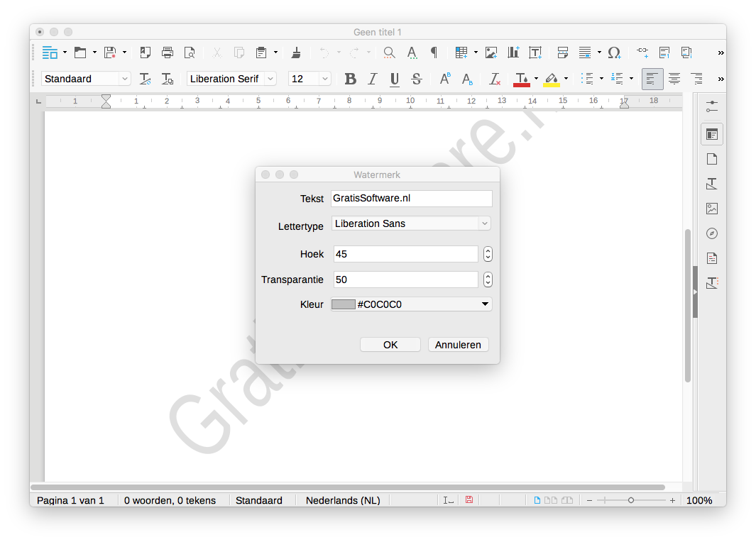 Watermerk maken in LibreOffice 5.4 (onder menu Opmaak | Watermerk)
