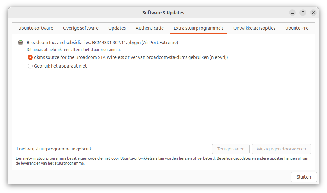 Ga in Ubuntu naar de app Software & Updates en dan naar het tablad Extra stuurprogramma's en kijk of de wireless driver aanstaat: