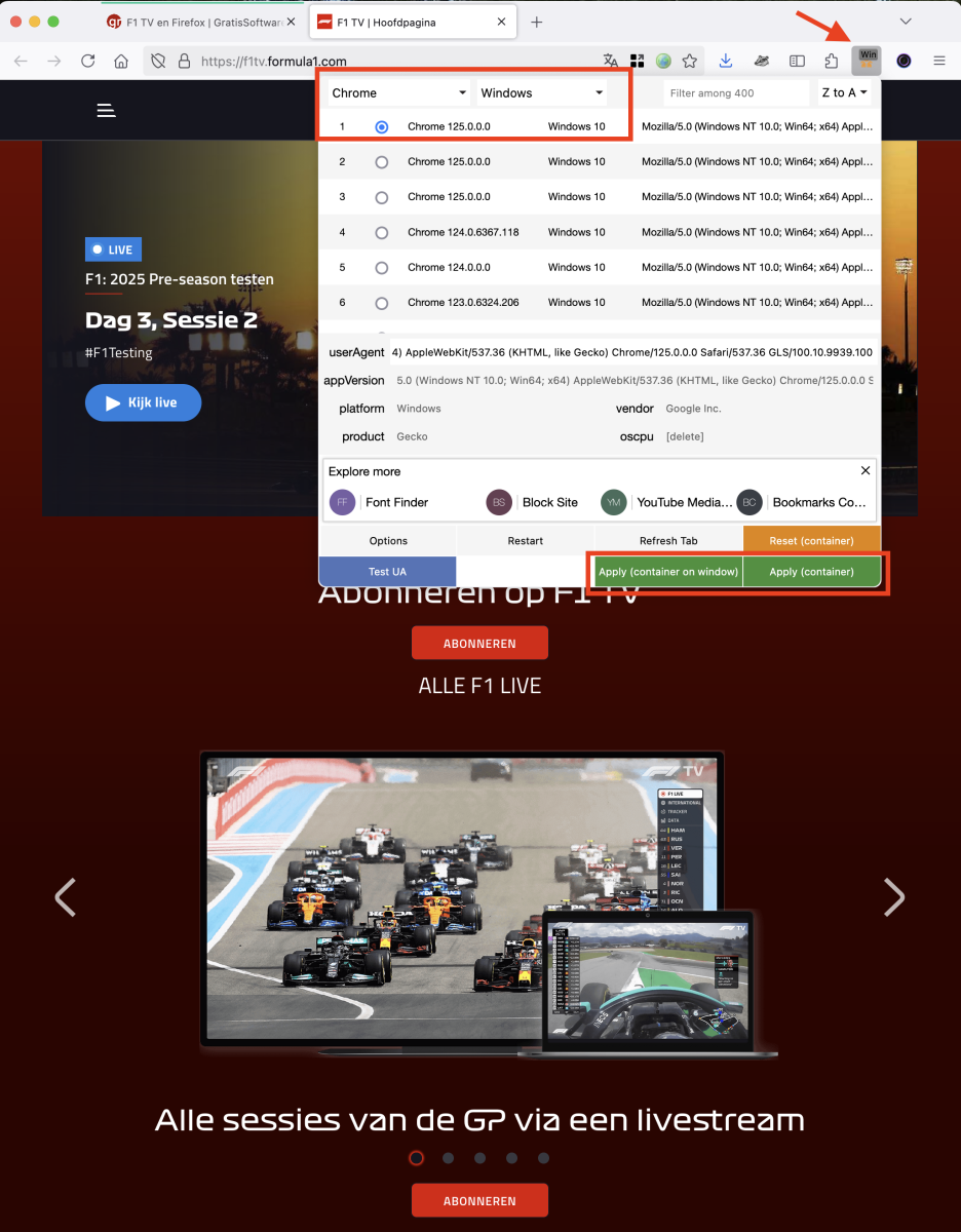 Bedankt redactie. Ik heb nogmaals de extensie geïnstalleerd, daarna de extensie ingesteld zoals op de afbeelding te zien is. Nu kan ik uitstekend F1 TV bekijken in Firefox. Voorafgaand lukte het mij niet de extensie te vinden. Het zat verborgen in het extensie vak op de menubalk. Ondanks verwarrende interface toch nog gelukt.
