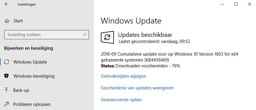 De update hier zojuist via de reguliere weg gedownload en geïnstalleerd, dus via Windows Update en niet via de Microsoft Update Catalogus. Ik heb Windows Update weliswaar handmatig laten zoeken en KB4458469 werd snel en zonder problemen geïnstalleerd.