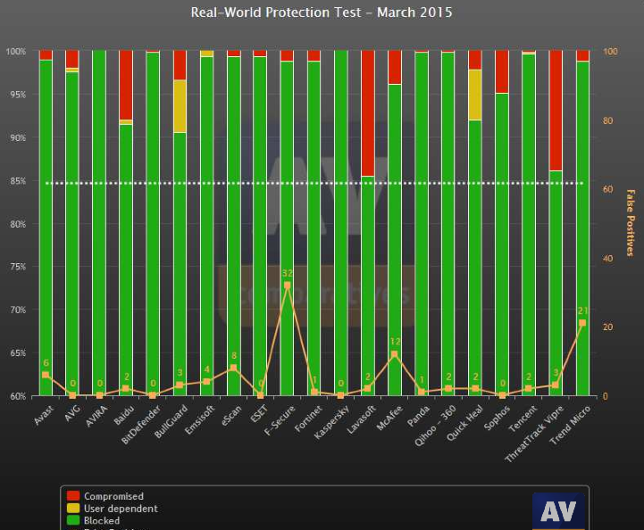 Daarvoor zoekt AV Comparatives op het web naar schadelijke sites die malware op je pc proberen te zetten. In maart gebruikte AV Comparatives voor de test 410 kwaadaardige sites die malware aanboden via drive-by downloads. Gekeken werd hoeveel bedreigingen geblokkeerd werden door de anti-virus software. Hieronder de resultaten.