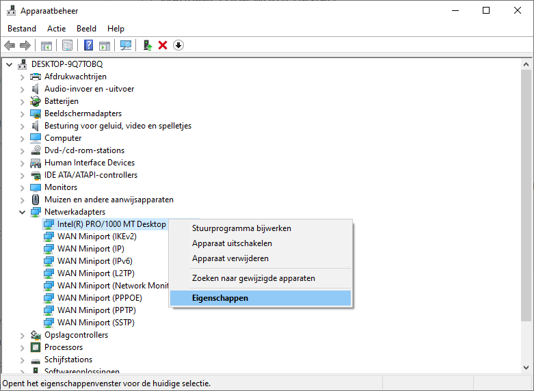 3. Ga naar Netwerkadapters en klik rechts op de juiste (ethernet)adapter en kies Eigenschappen: