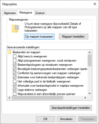 Als je een bepaalde weergave voor alle mappen in Verkenner wilt, doe dan nog het volgende, na je aanpassing van één map: