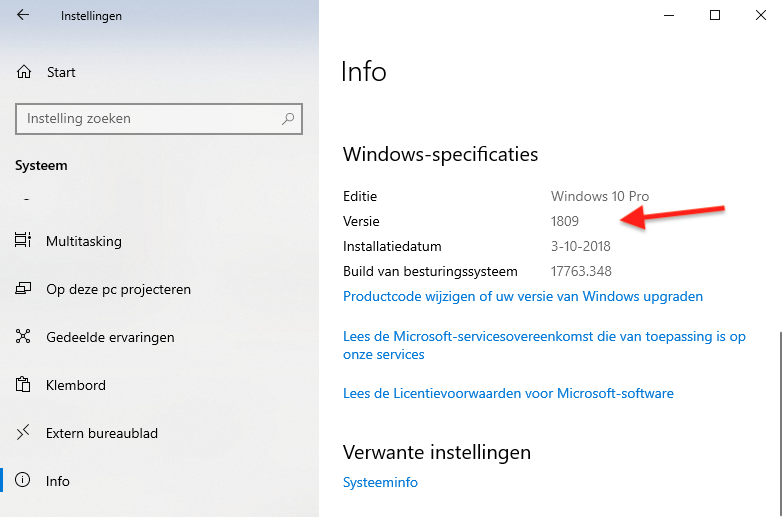 Onder Instellingen | Systeem | Info (onderaan) - Windows-specificaties (onderaan) kun je kijken welk Windows 10 versienummer je hebt. Ook het buildnummer vind je hier.