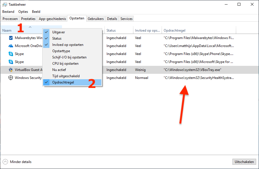 Je kunt kijken waar ze naar verwijzen door in Taakbeheer | tabblad Opstarten rechts te klikken op de titel van de kolom Naam (1 in de afbeelding).