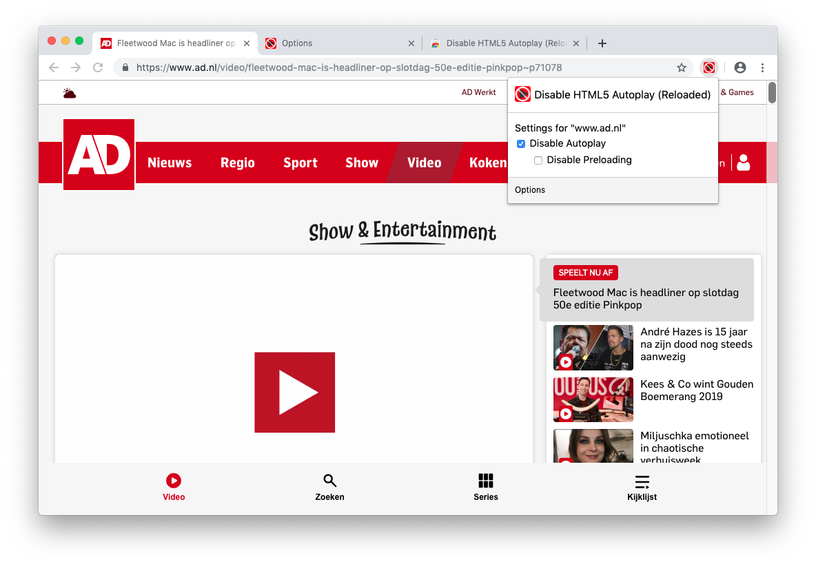 Na installatie moet je rechtsklikken op het icoontje van en kiezen voor Options. Vervolgens haal je het vinkje weg voor Disable preloading (want anders werkt de hele video niet meer). Disable autoplay moet natuurlijk wel aanstaan.