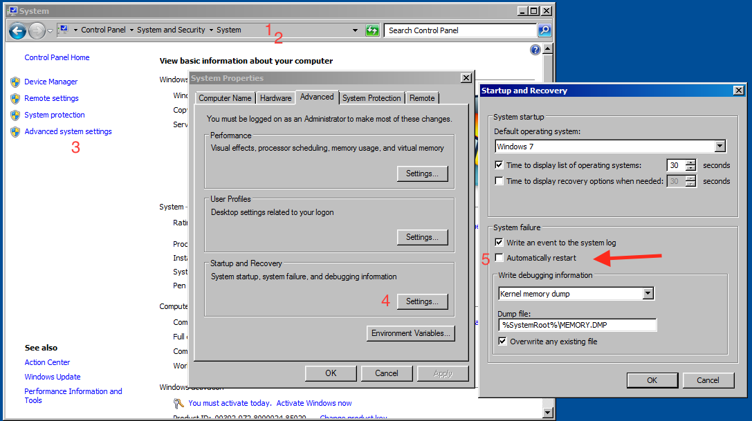 5. Haal vinkje weg bij Automatisch herstarten onder Systeemcrash en klik OK