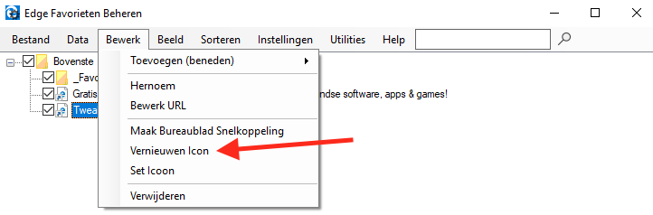 Selecteer (vink aan) de gewenste (of alle favicons) en kies Bewerk | Vernieuwen Icon