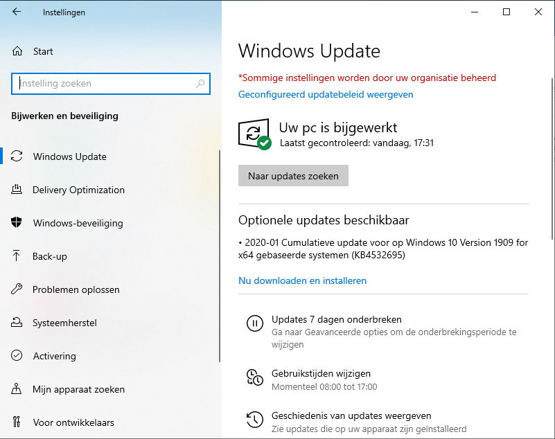 Versie End of life (einde updates) Windows 10 1809 12 mei 2020 Windows 10 1903 8 december 2020 Windows 10 1909 11 mei 2021
