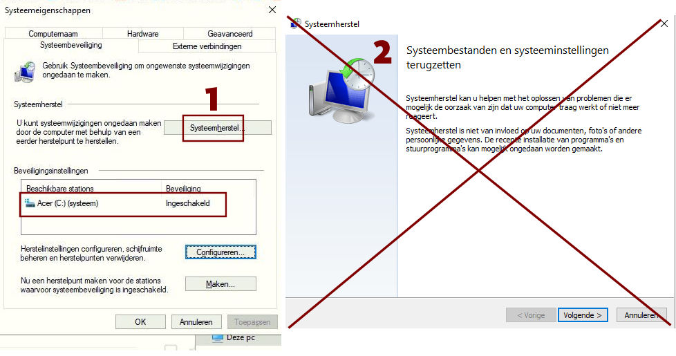 normaal gezien bij 't aanklikken van de tab SYSTEEMHERSTEL aangeduid als punt EEN, dient een ander 'scherm' zich te openen - aangeduid als punt TWEE, van het voorbeeld.