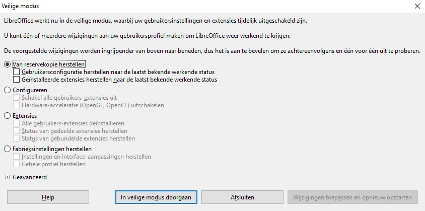 Zo heeft LibreOffice 5.3 een veilige modus: als het programma - vaak - crasht kun je extensies en gebruikersinstellingen uitschakelen en opnieuw starten. Door profielen, extensies en hardware accelleratie uit te zetten of te herstellen kun je zo de boosdoener van de instabiliteit vinden en LibreOffice weer herstellen. Ook kun je teruggaan naar de 'fabrieksinstellingen'.