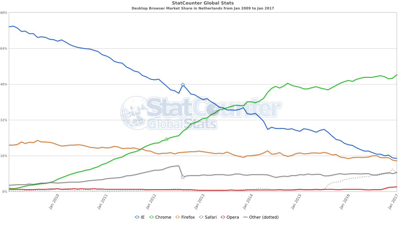 Browserstatistieken op pc en laptop in Nederland 2009-2017 (klik voor groter)