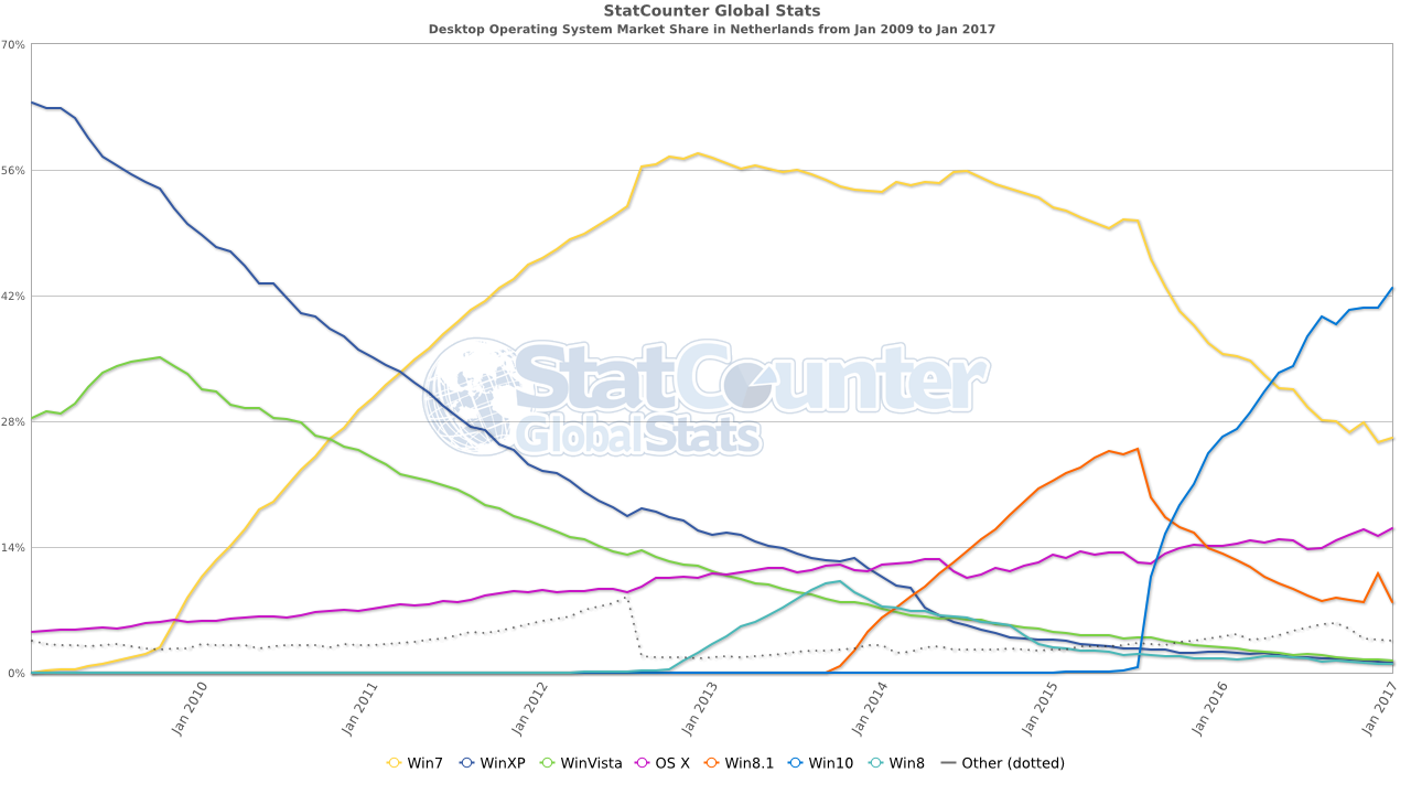 Statistieken van desktop besturingssysteem in Nederland 2009-2017 (klik voor groter)