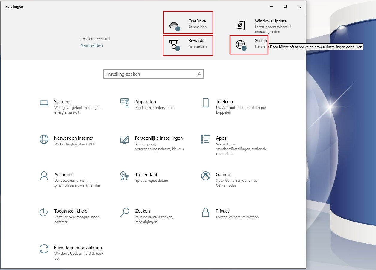 vreemd, ik heb die 'voorstellen' nog nooit gezien. Ik gebruik ook een lokaalaccount, en geen OneDrive en Edge ......