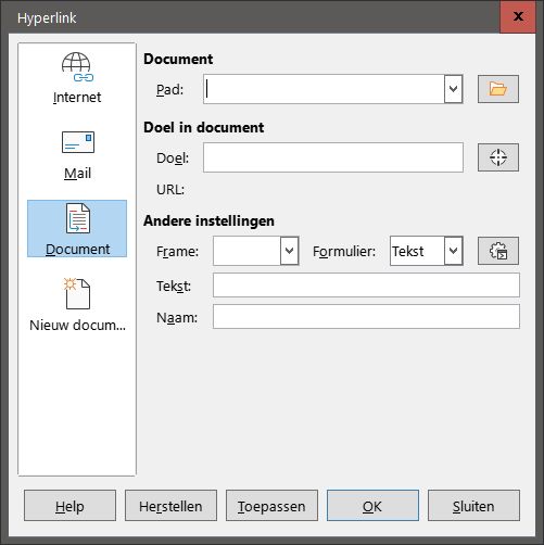 Bij Tekst geef je op wat op de plaats van de hyperlink moet komen te staan, in dit geval dus Blauw,