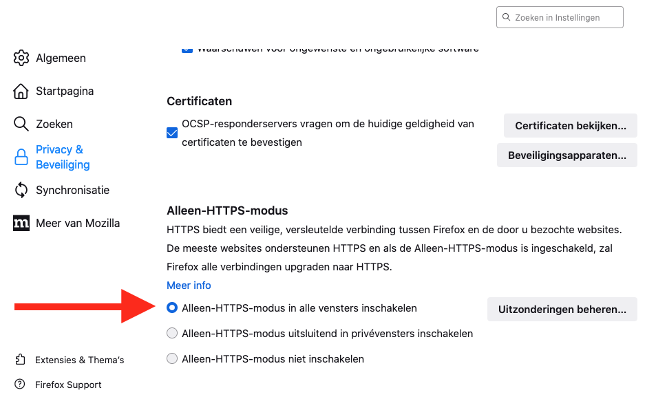 In de Instellingen van Firefox onder Privacy & beveiliging kun je helemaal onderaan (naar beneden scrollen) onder Alleen HTTPS-modus nog wel inschakelen dat alleen websites met beveiligde verbindingen (https) openen en dat je anders een waarschuwing krijgt.