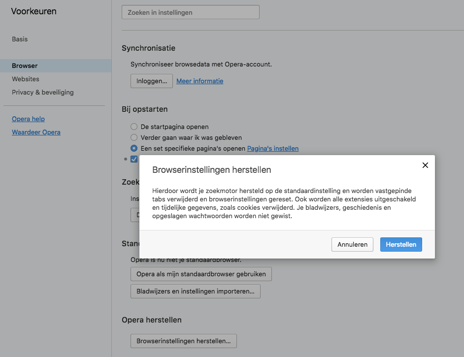 - onder Instellingen | Browser is nu een knop om alle instellingen in Opera snel te Herstellen (als je problemen ondervindt kan dit helpen)