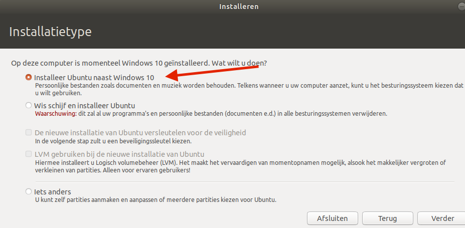 Edit: Mmm, vreemd genoeg krijgen we deze optie helemaal niet als we Ubuntu op een oude Windows-laptop willen installeren. Alleen de optie om de gehele schijf te wissen - en dat willen we natuurlijk niet!!! Of handmatig partities te maken. Wat zijn de ervaringen van anderen hiermee?
