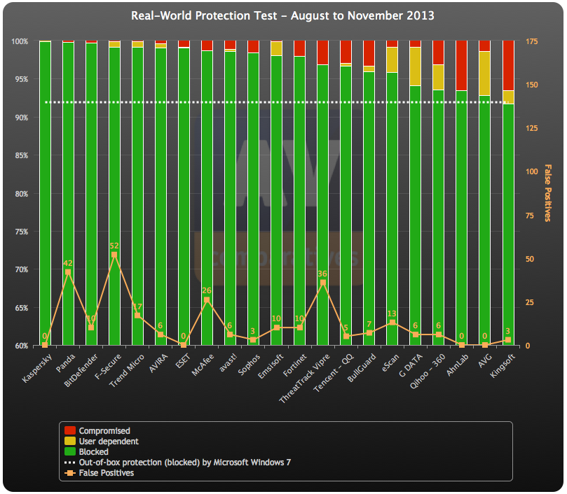 Bovenstaande grafiek (klik voor groter) laat de resultaten zien. Over de maanden augustus tot en met november waren Kaspersky, het gratis Panda Cloud Free Antivirus en BitDefender de beste. Zij blokkeerden bijna 100% van de dreigingen (groene balk). Panda Cloud had als nadeel echter dat het 42 vals positieve meldingen gaf, waarbij een onschuldig bestand onterecht als schadelijk wordt aangemerkt (zie gele lijn onderin de grafiek).